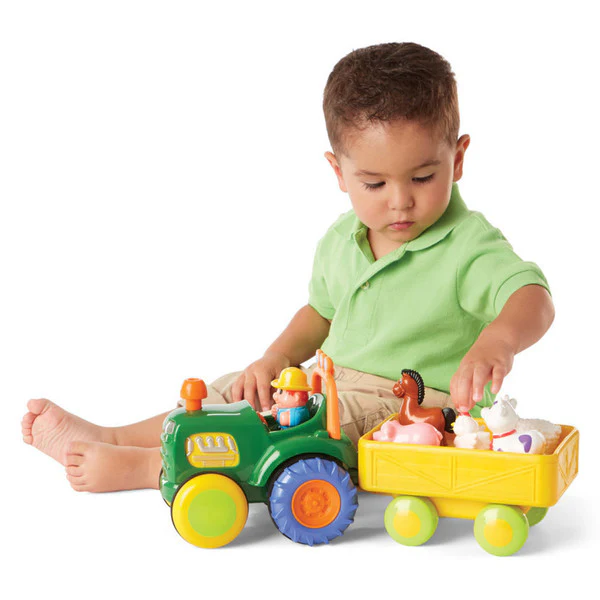 Five animal friends stand in the trailer and make animal sounds when placed in their appropriate spots. Press the funnel to hear realistic engine sounds and then the tractor rolls along for 10 seconds. Push the driver to hear a fun melody. Push the steering wheel to hear a horn sound.